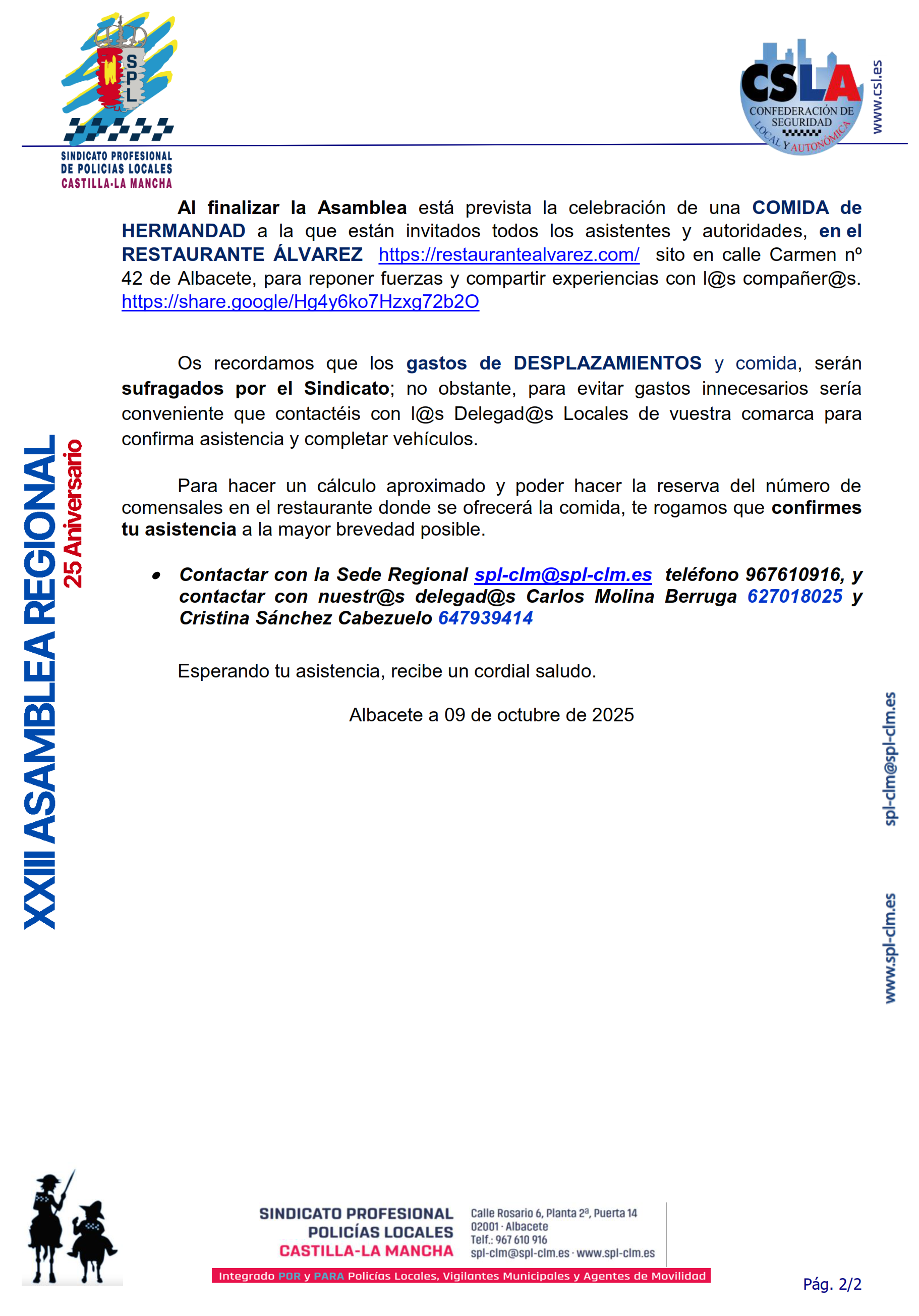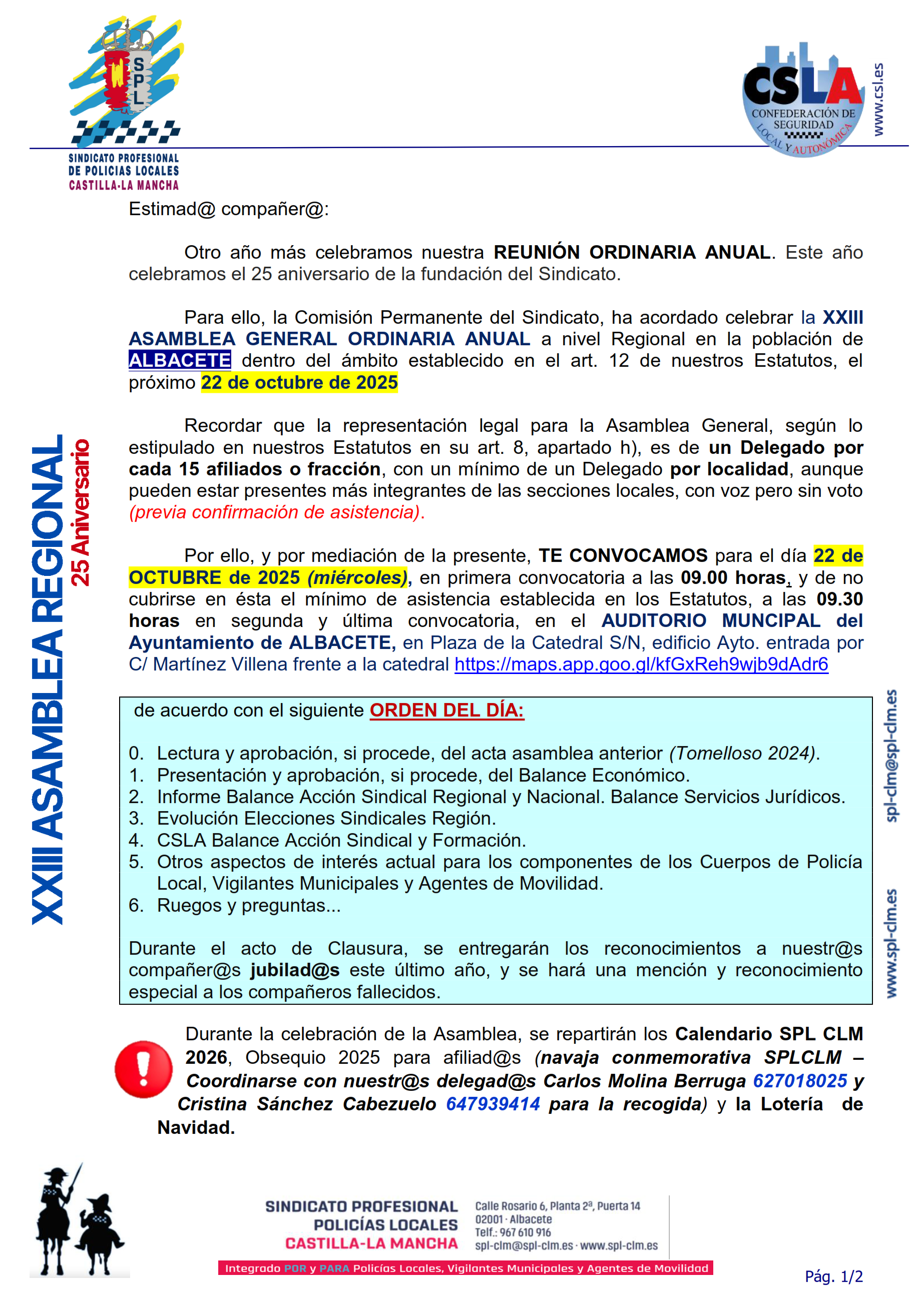 CONVOCATORIA DELEGADOS XXIII ASAMBLEA REGIONAL SPL CLM ALBACETE 22 OCTUBRE 2025